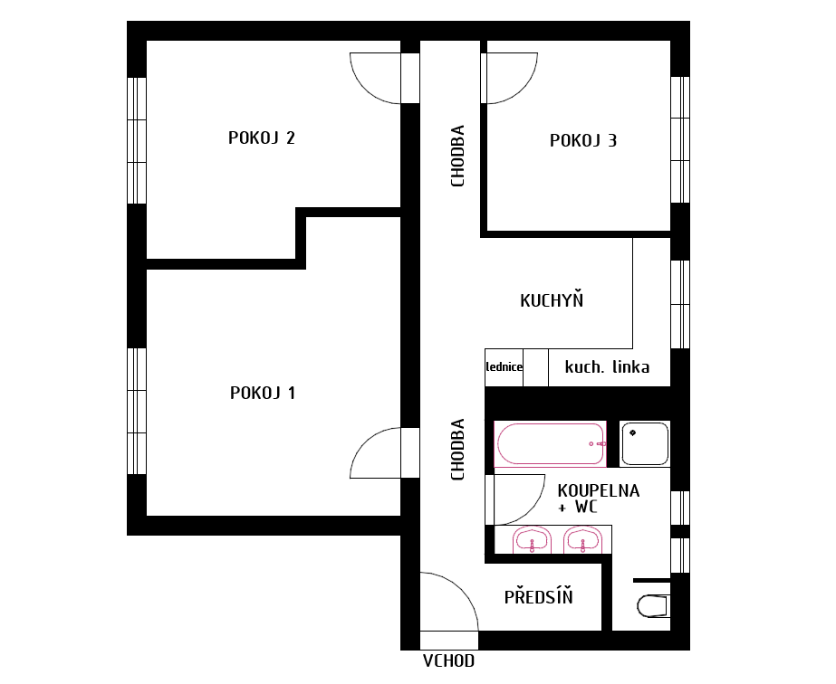Součástí bytu je samostatná kuchyně s vestavěnými spotřebiči, prostorná koupelna se dvěma okny, vanou i sprchovým koutem a tři plnohodnotné pokoje. K bytu náleží dvě sklepní kóje, což je v centru města velmi příjemný bonus. Parkování je možné přímo před domem – zdarma.
