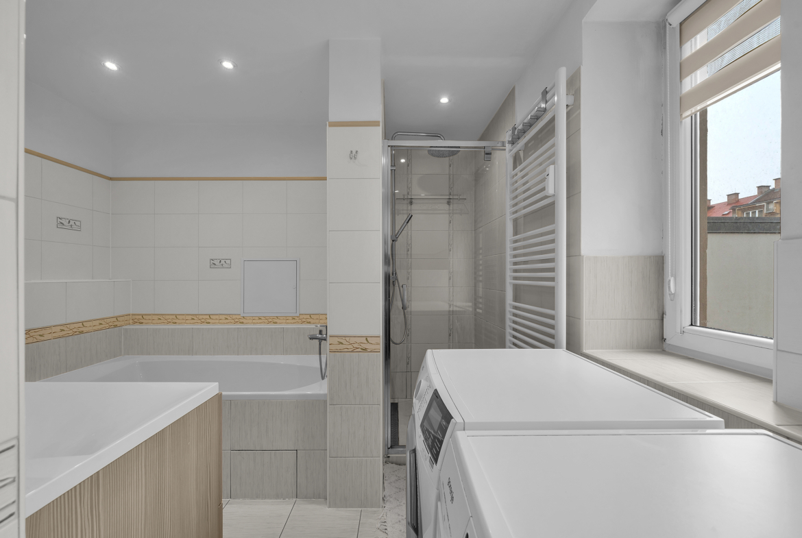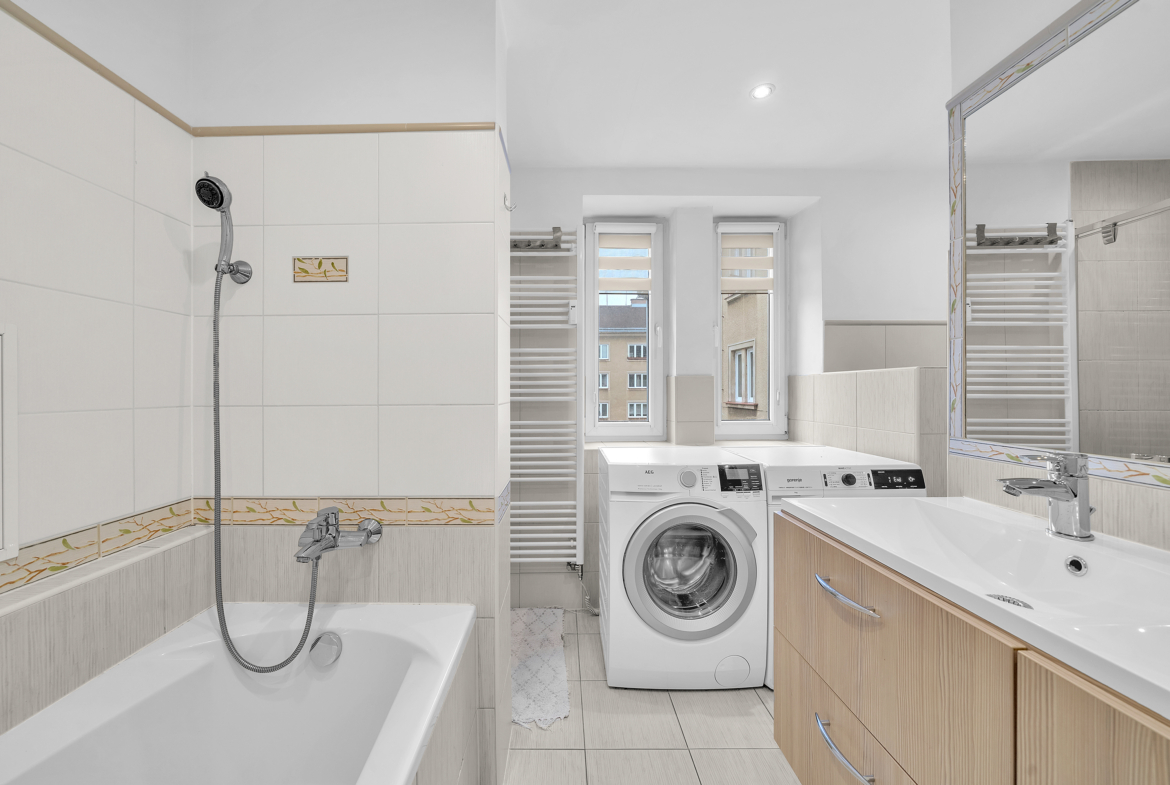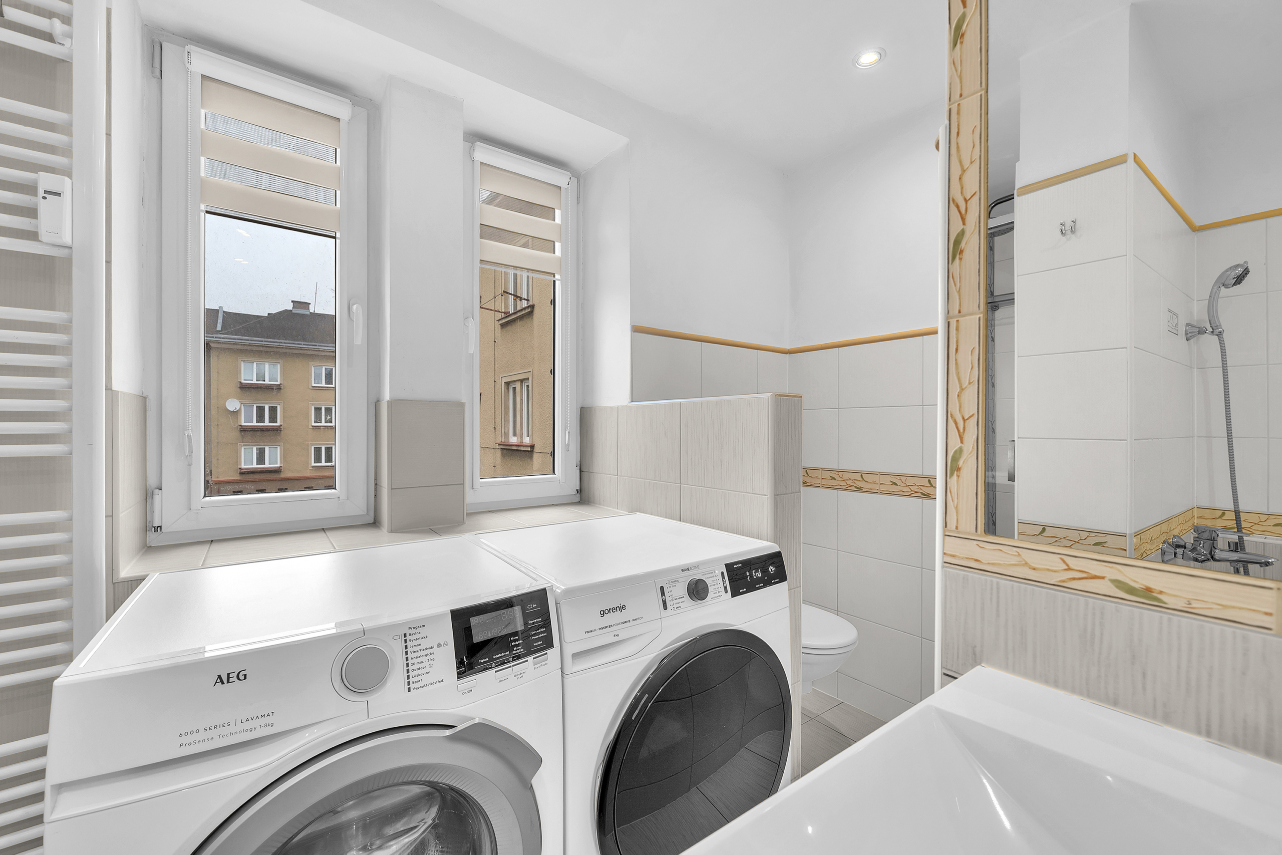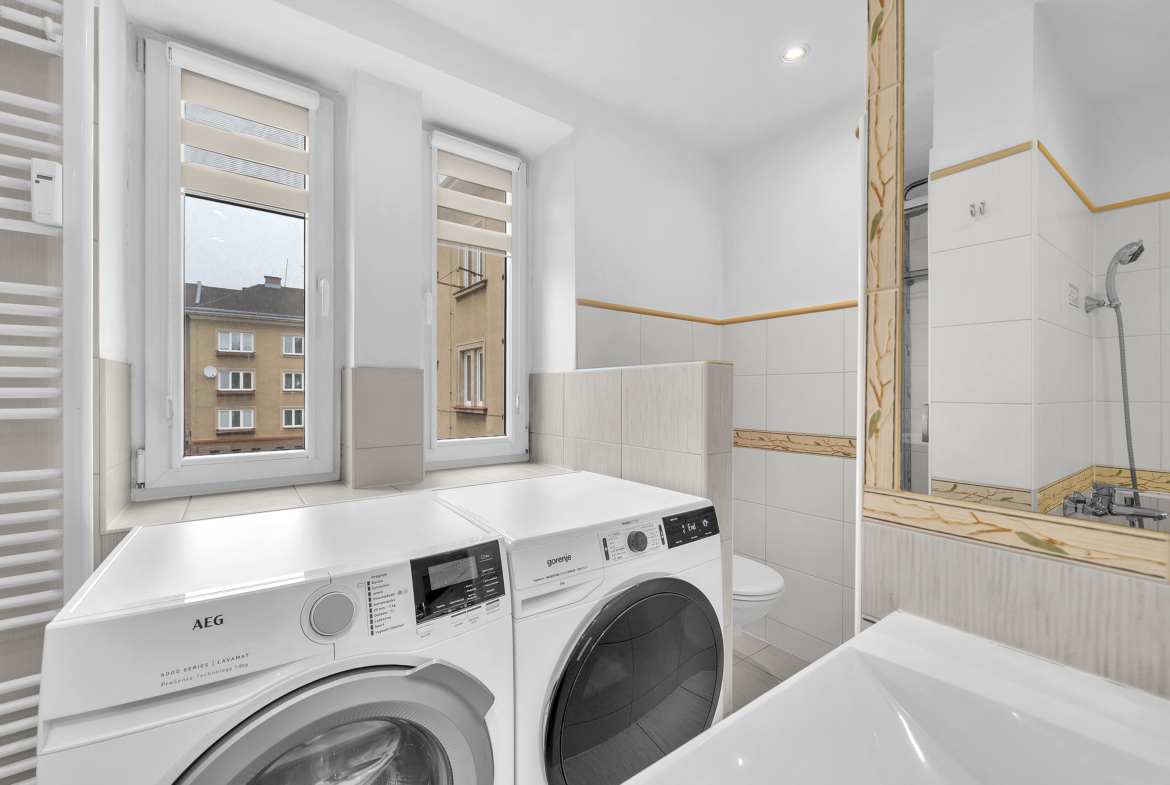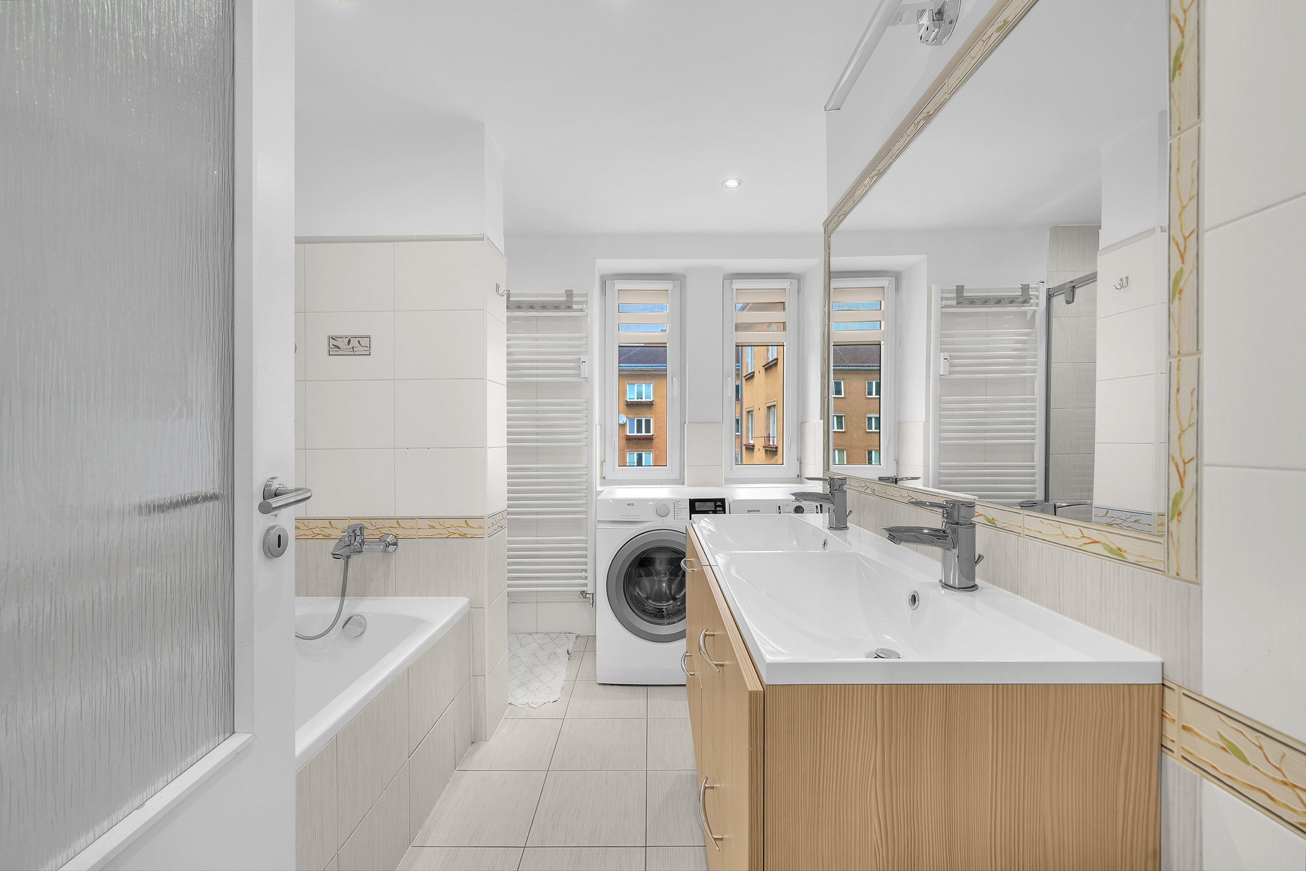 Součástí bytu je samostatná kuchyně s vestavěnými spotřebiči, prostorná koupelna se dvěma okny, vanou i sprchovým koutem a tři plnohodnotné pokoje. K bytu náleží dvě sklepní kóje, což je v centru města velmi příjemný bonus. Parkování je možné přímo před domem – zdarma.