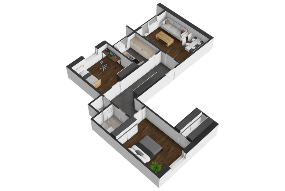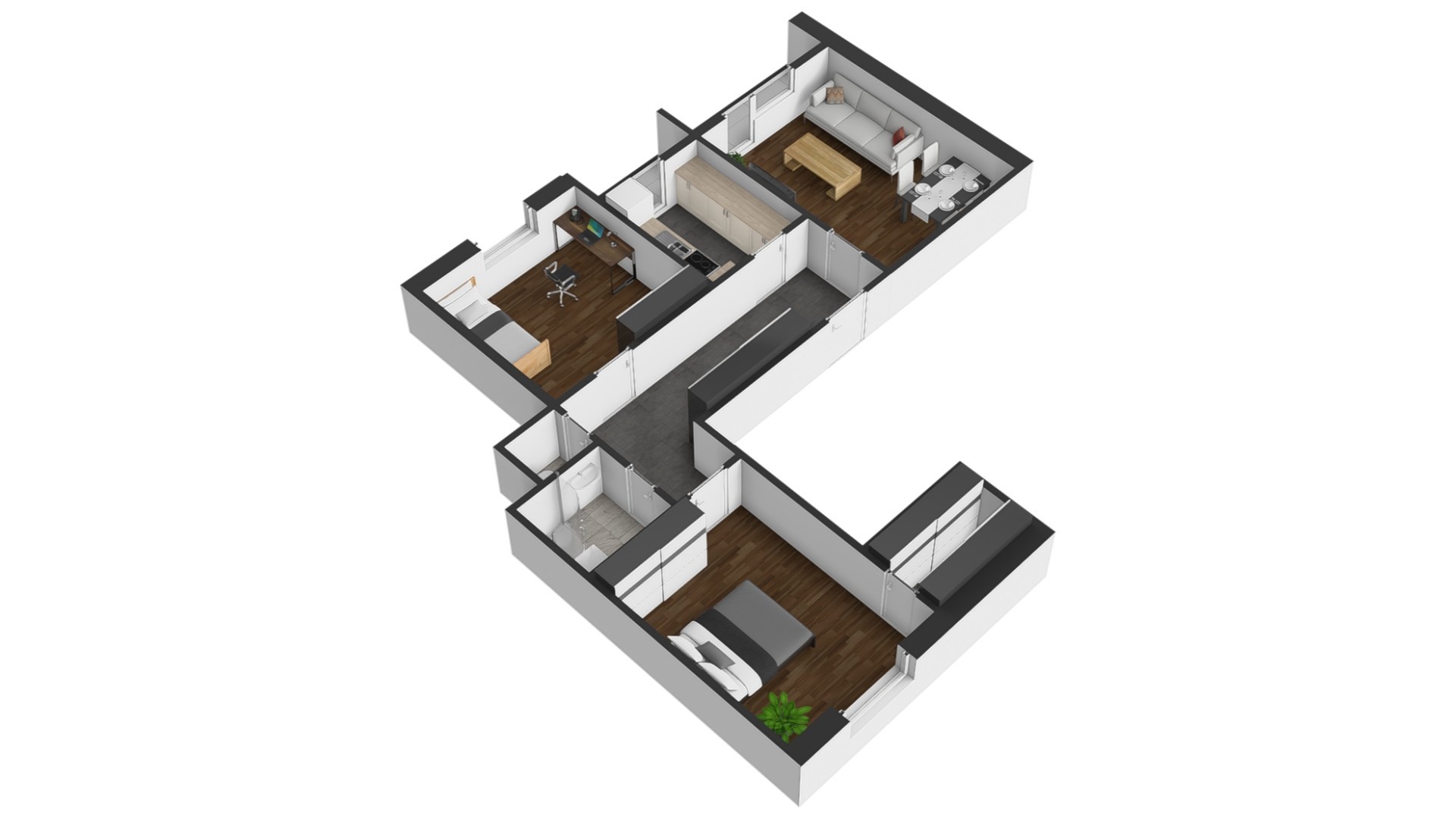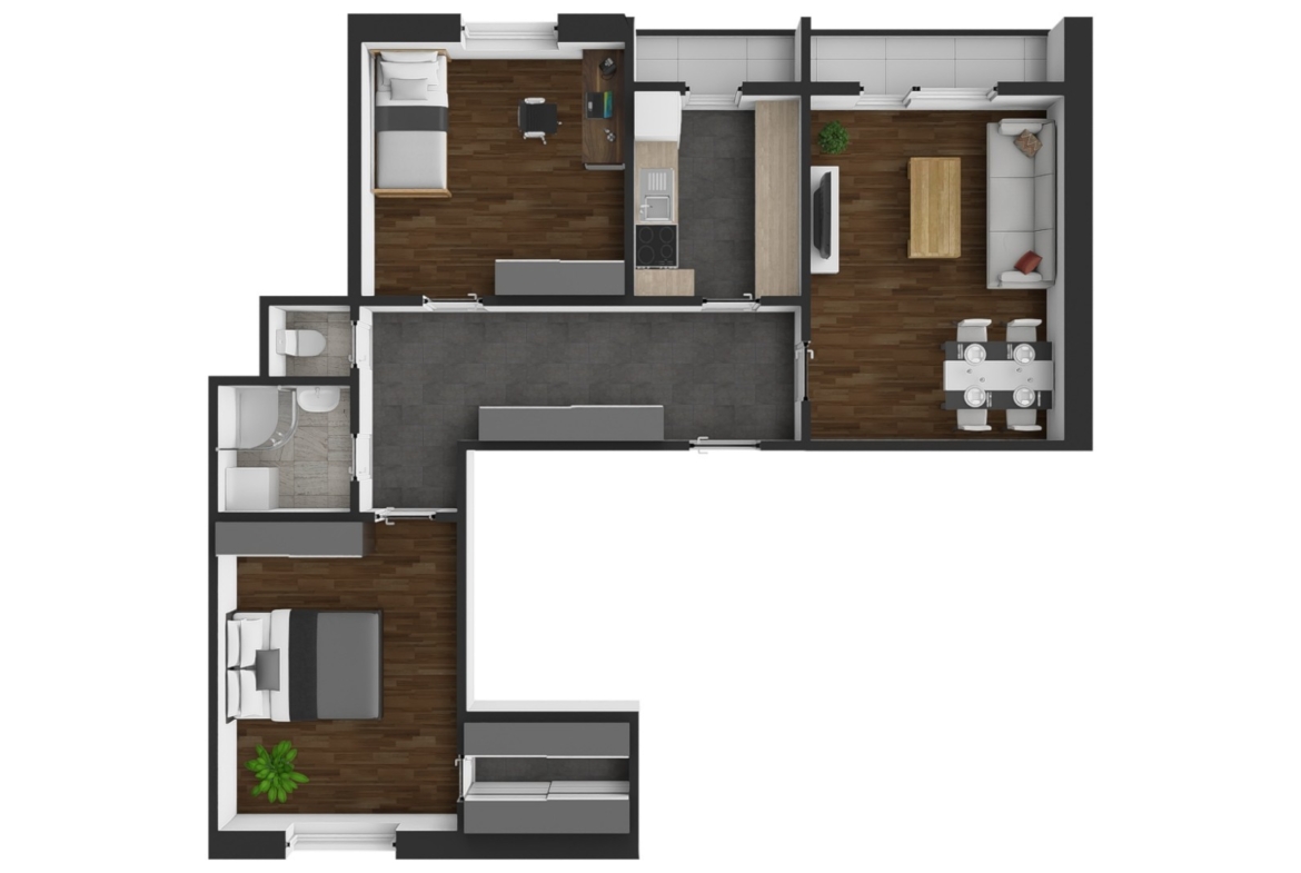 Velmi praktické řešení a dispozice tohoto bytu nabízí prostorná vstupní chodba, která odděluje všechny místnosti, takže žádný pokoj není průchozí.