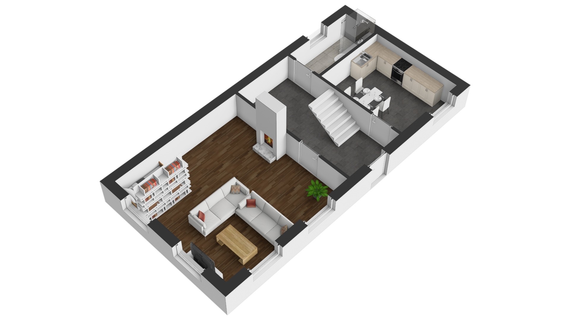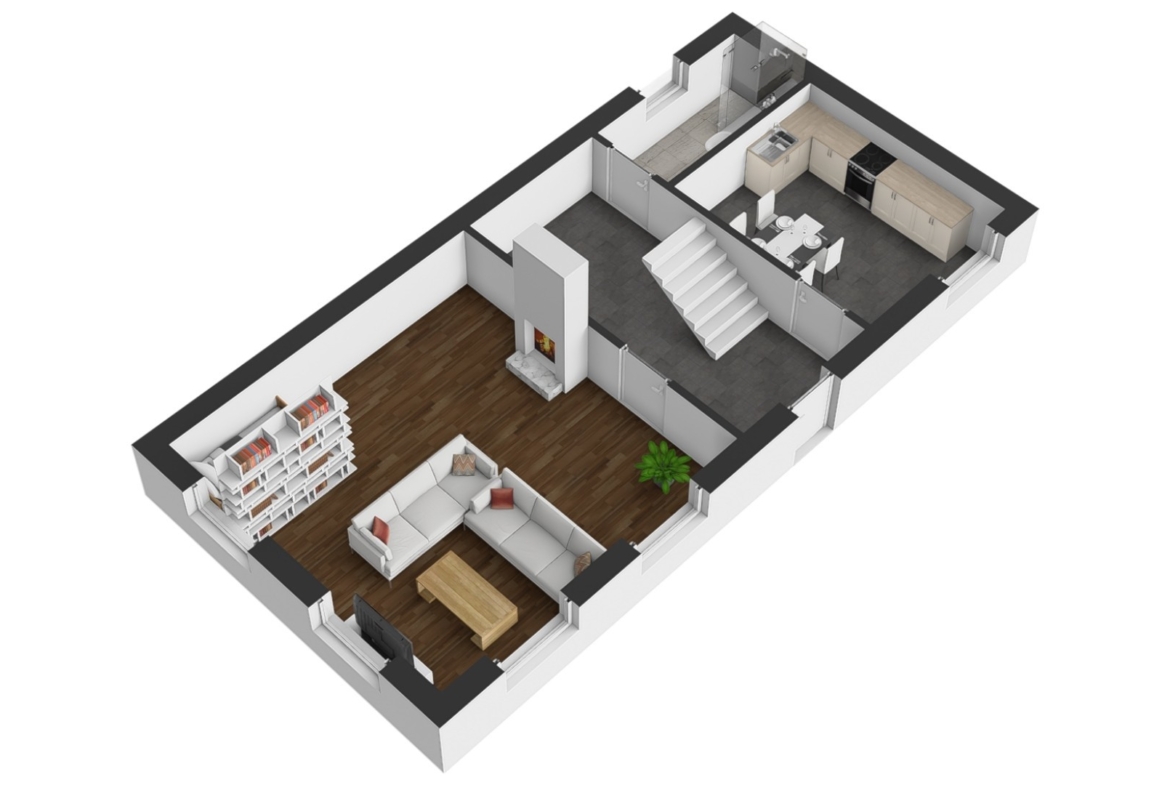 V přízemí se nachází chodba se vstupem do 2. nadzemního podlaží. V levé části domu je prostorný obývací pokoj propojený s ložnicí, samostatná kuchyně s kuchyňskou linkou a spotřebiči a koupelna s vanou a WC.