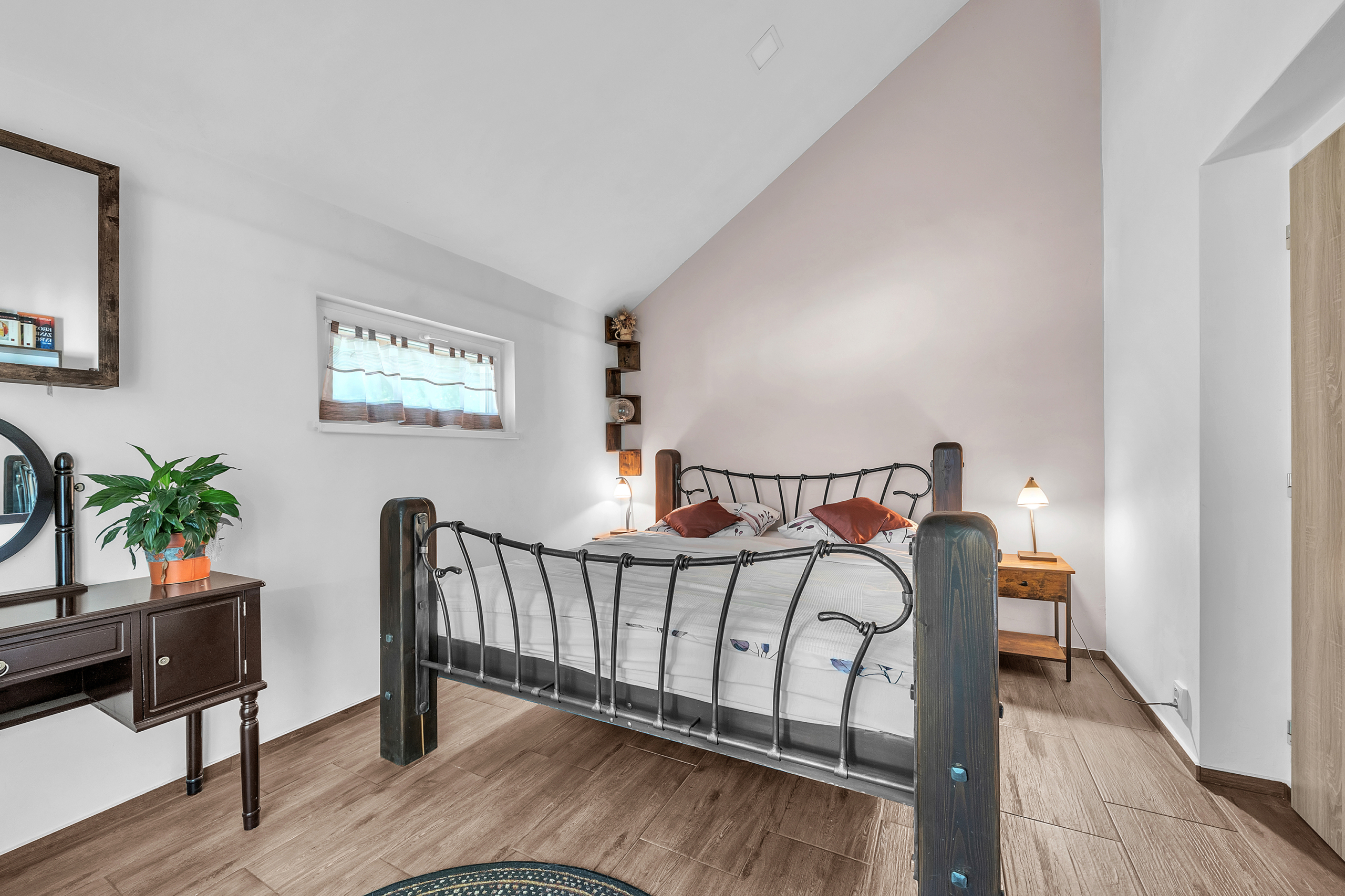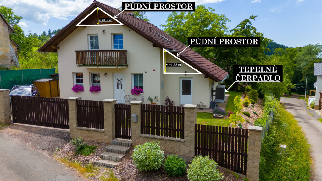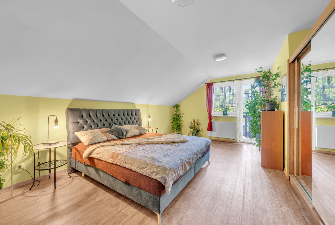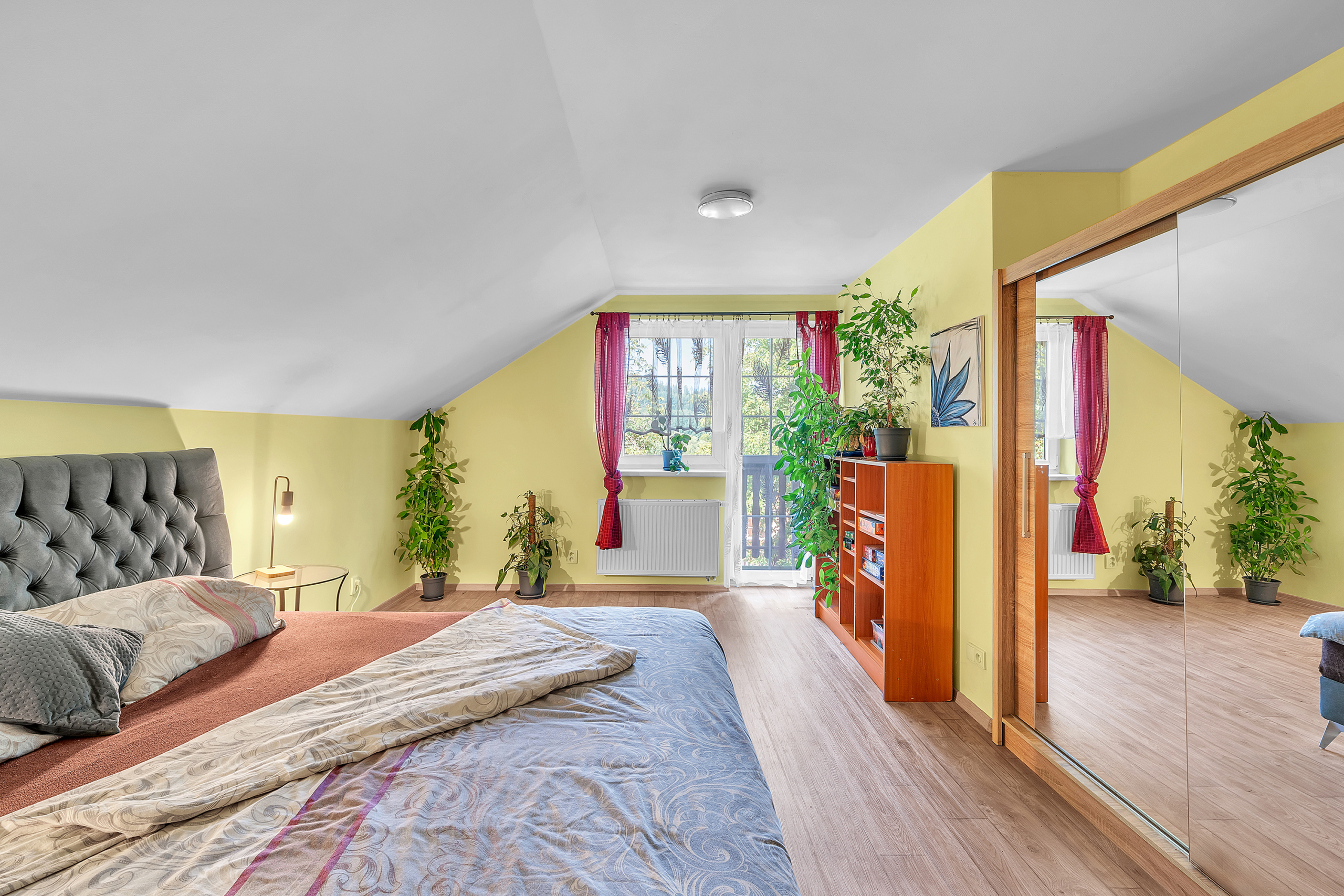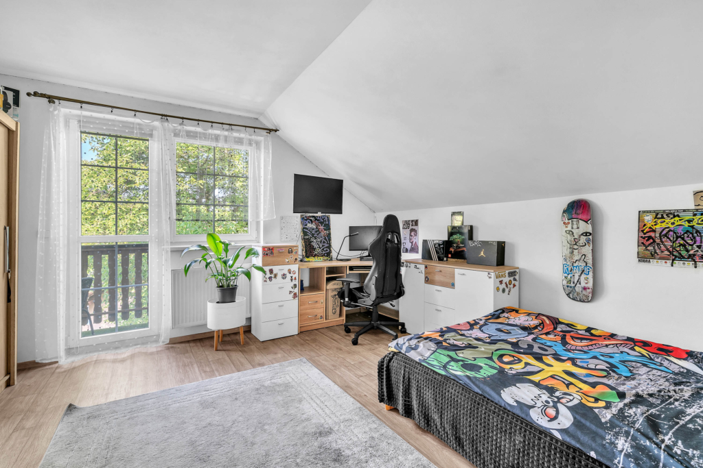 najdete druhou koupelnu s vanou, sprchou a WC, dva dětské pokoje a jeden pokoj pro hosty a půdní prostor. Dům má dva balkony – ideální místo pro ranní kávu nebo večerní odpočinek.