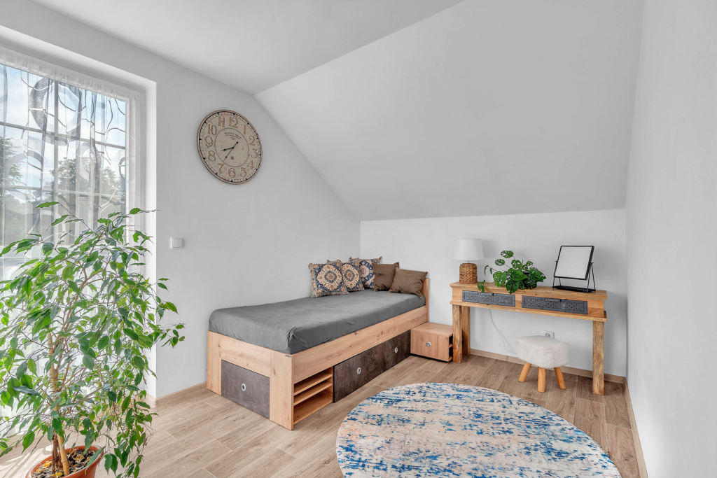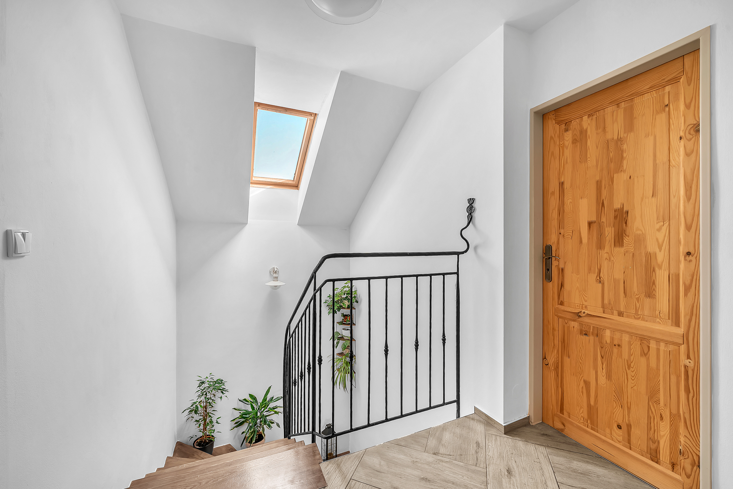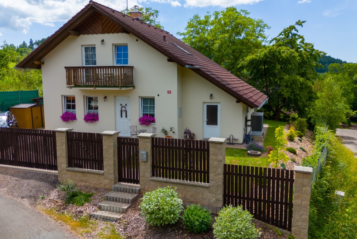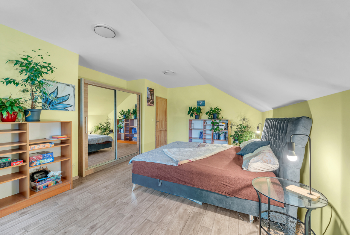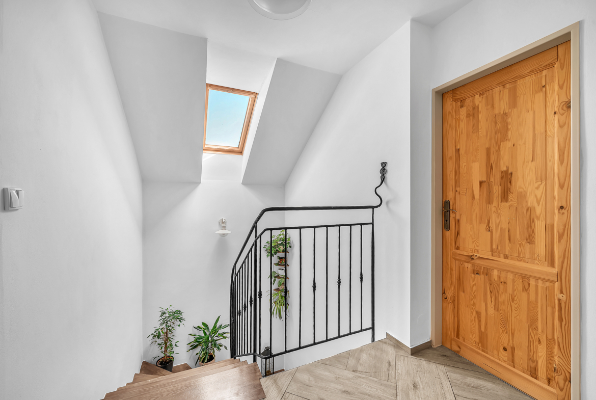 najdete druhou koupelnu s vanou, sprchou a WC, dva dětské pokoje a jeden pokoj pro hosty a půdní prostor. Dům má dva balkony – ideální místo pro ranní kávu nebo večerní odpočinek.