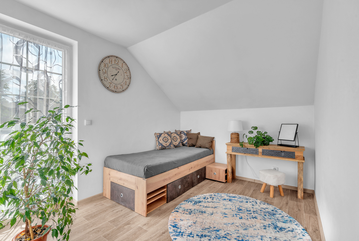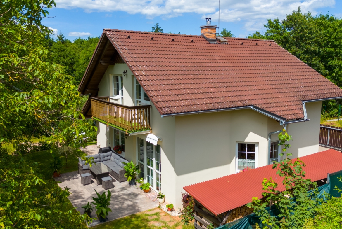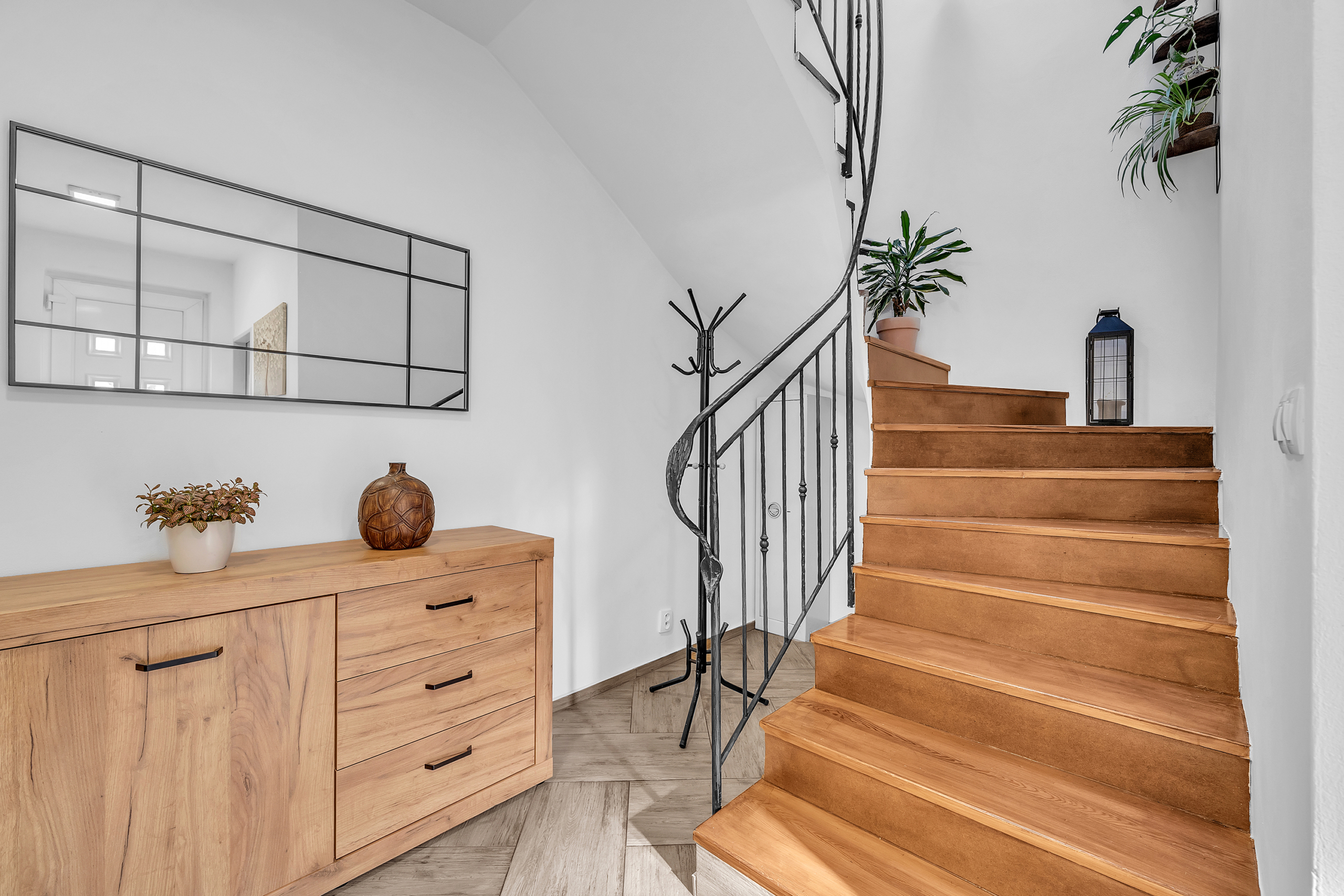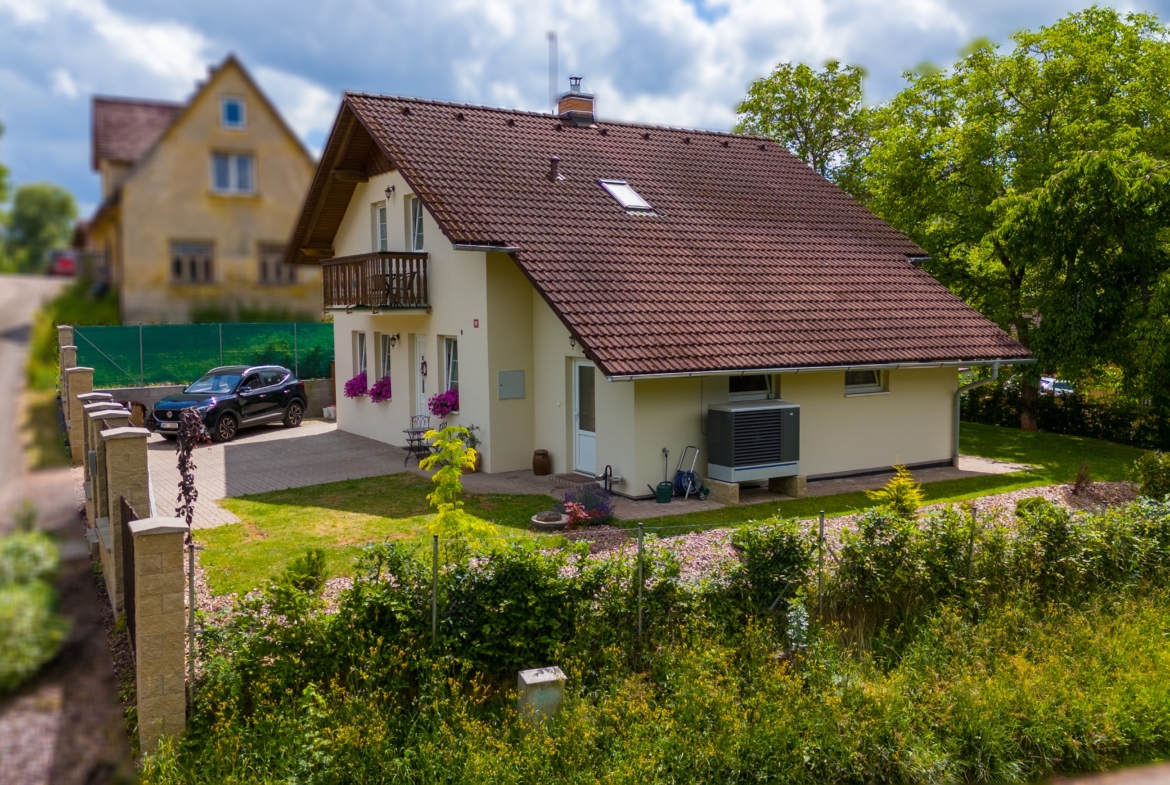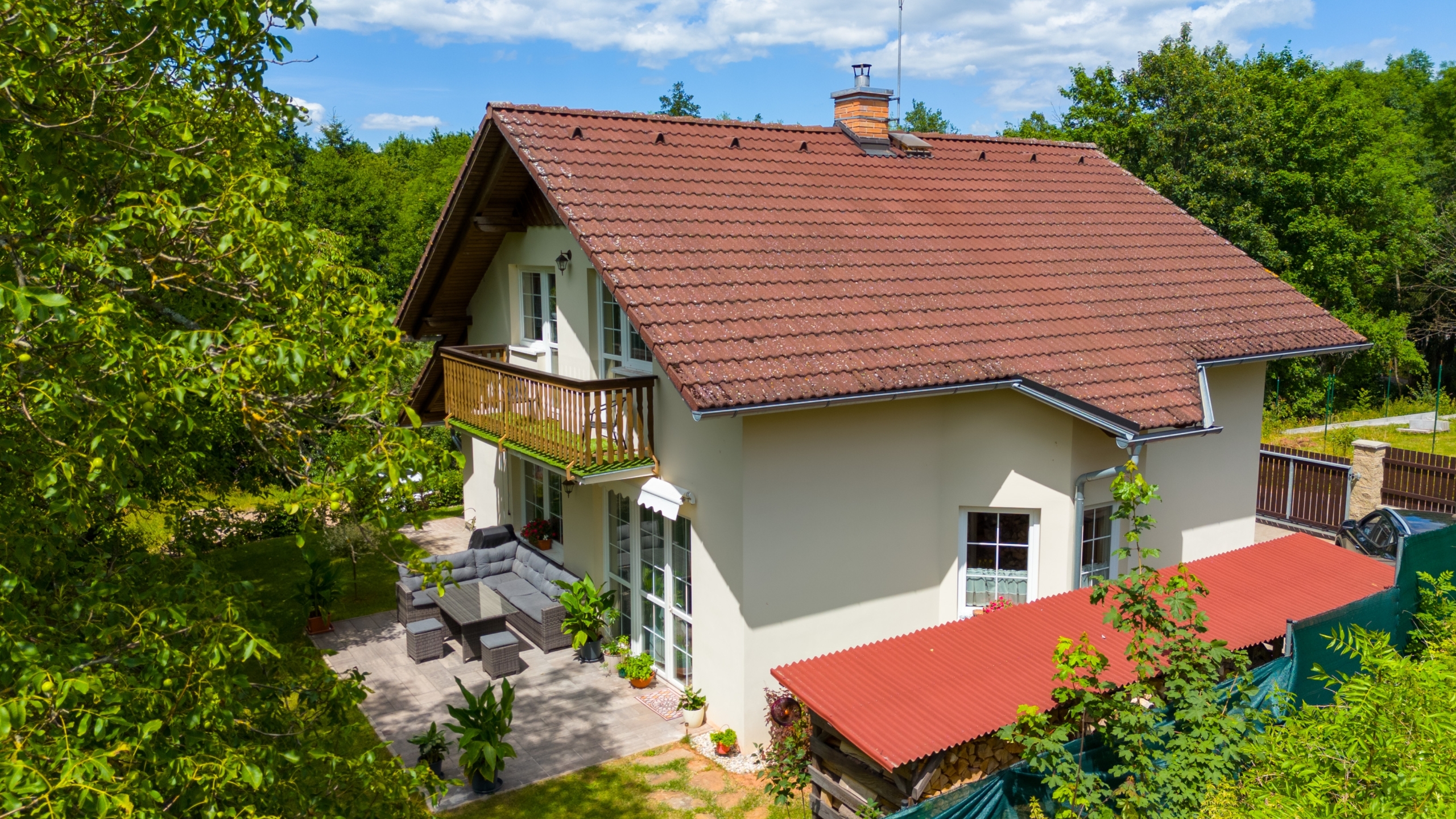 najdete druhou koupelnu s vanou, sprchou a WC, dva dětské pokoje a jeden pokoj pro hosty a půdní prostor. Dům má dva balkony – ideální místo pro ranní kávu nebo večerní odpočinek.