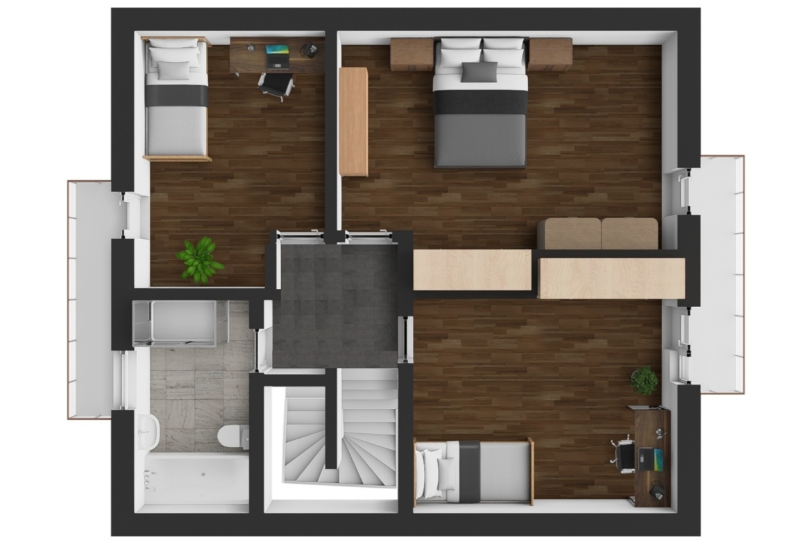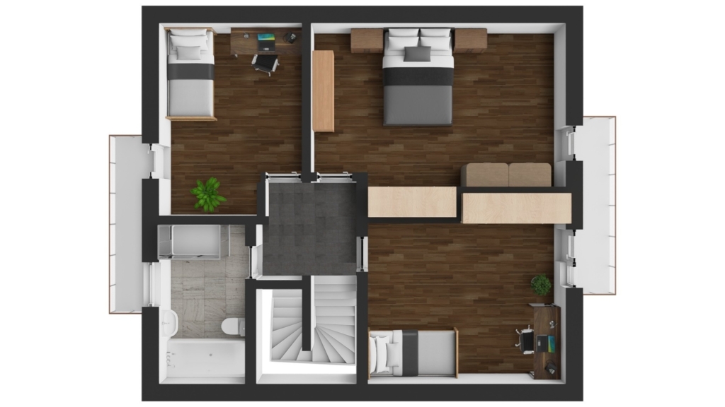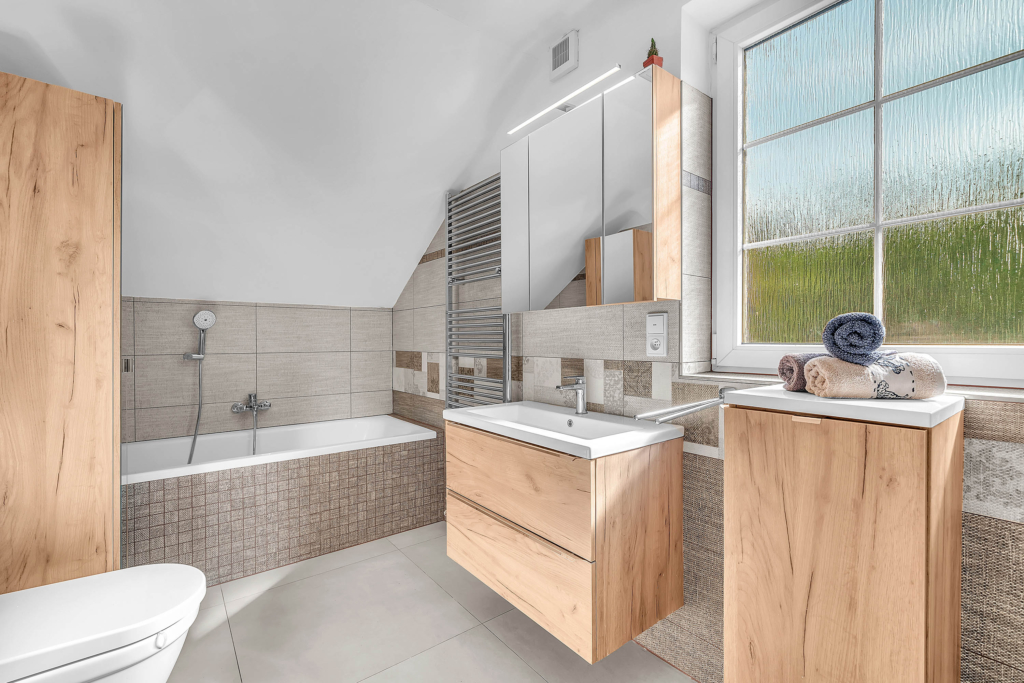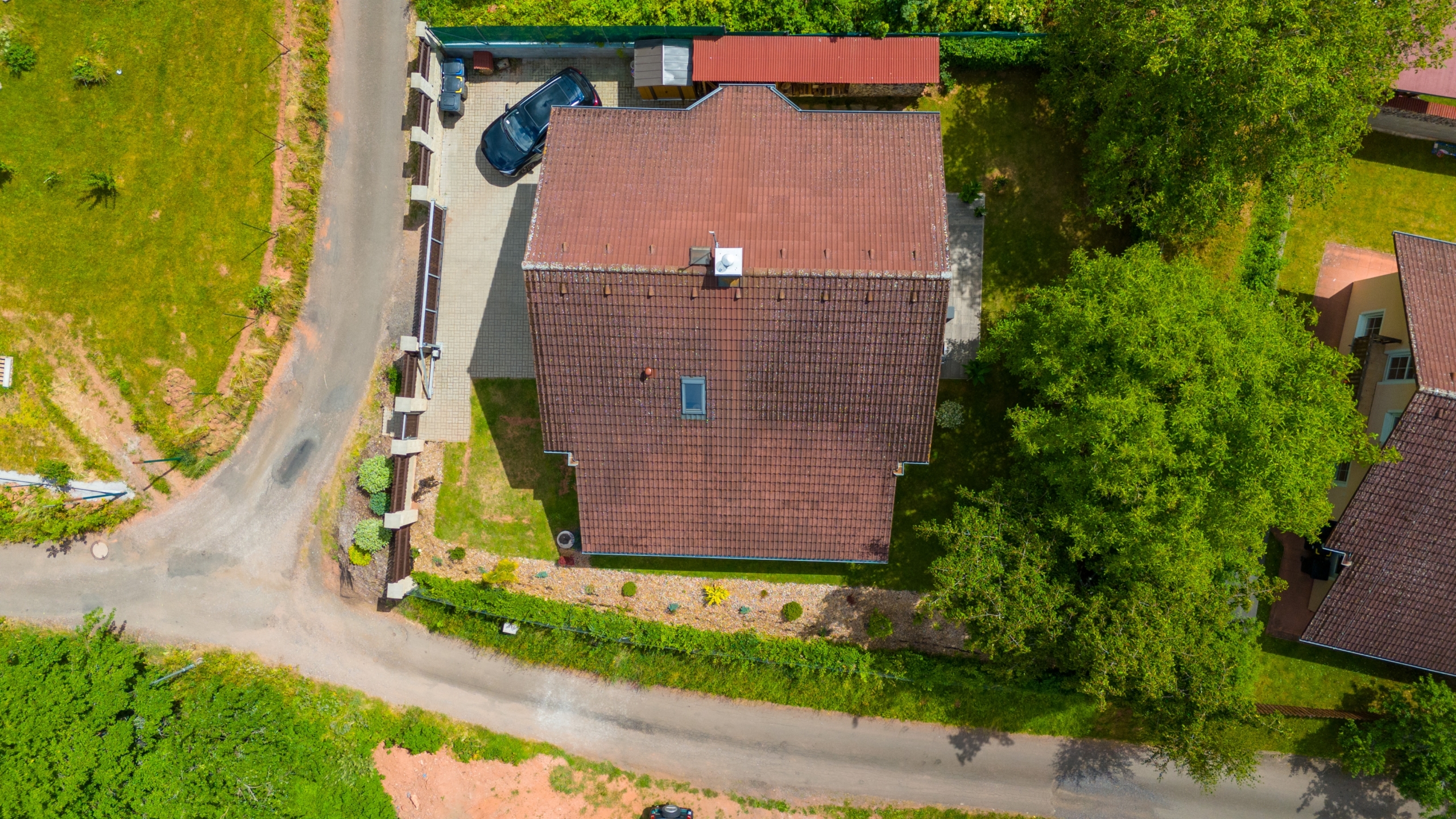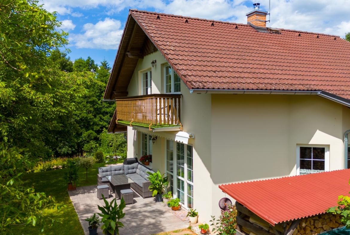 najdete druhou koupelnu s vanou, sprchou a WC, dva dětské pokoje a jeden pokoj pro hosty a půdní prostor. Dům má dva balkony – ideální místo pro ranní kávu nebo večerní odpočinek.